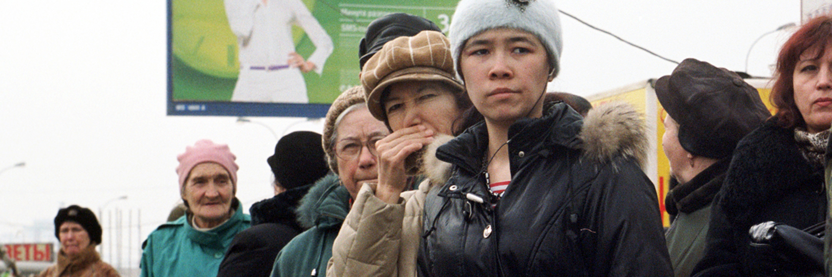 ‘We see people waiting for a bus at a bus stop. They are looking into the distance. Their anticipation is full of grief and discontent. […] They stare into the tomorrow while leaving the today behind. Remarkably, on the blurry background of one of the photographs one can notice a blurry ad sign saying TODAY.’